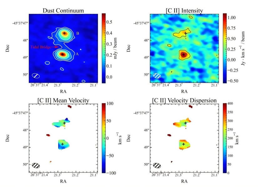 Наблюдения показали, что объект J2037–4537 — это две сливающиеся галактики с активными чёрными дырами, а не эффект гравитационного линзированияАстрономы с помощью радиоинтерферометра обсерватории ALMA подтвердили существование редкой тесной пары квазаров J2037–4537, расположенной в ранней ...